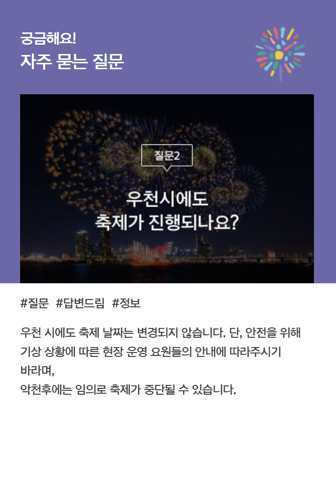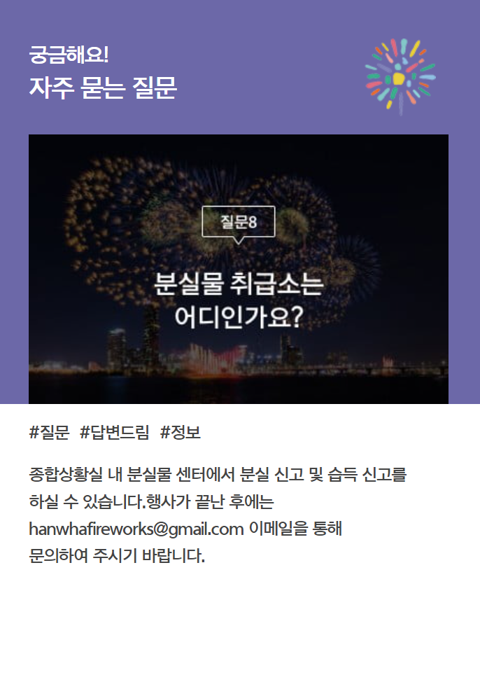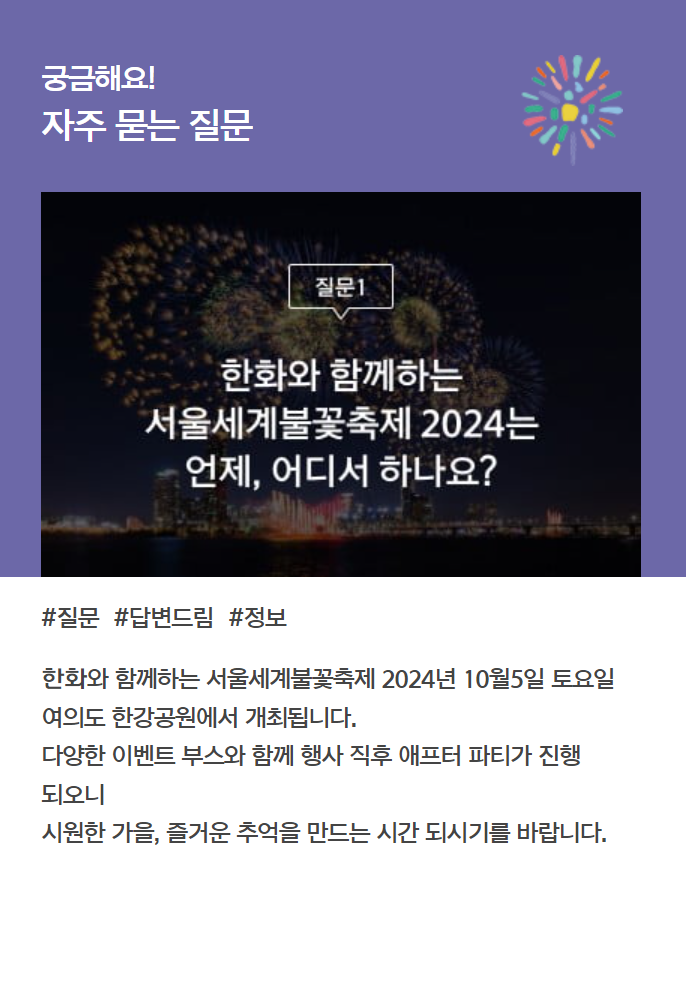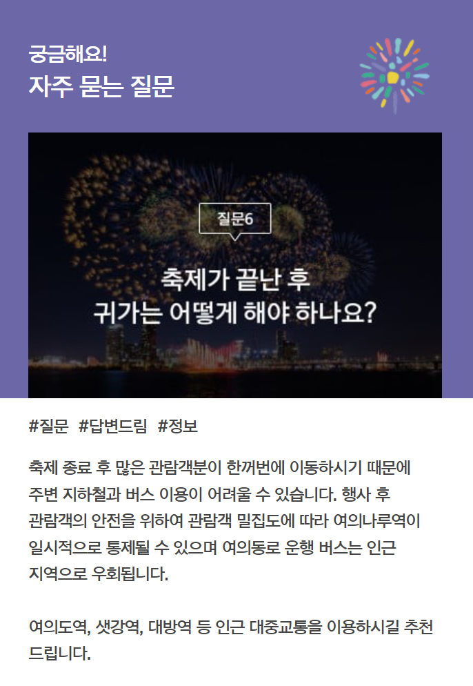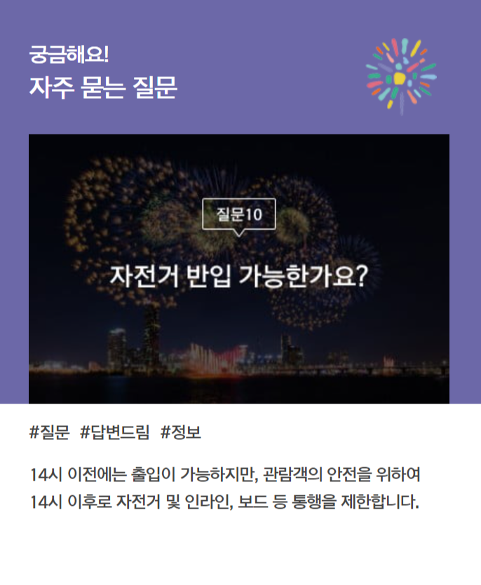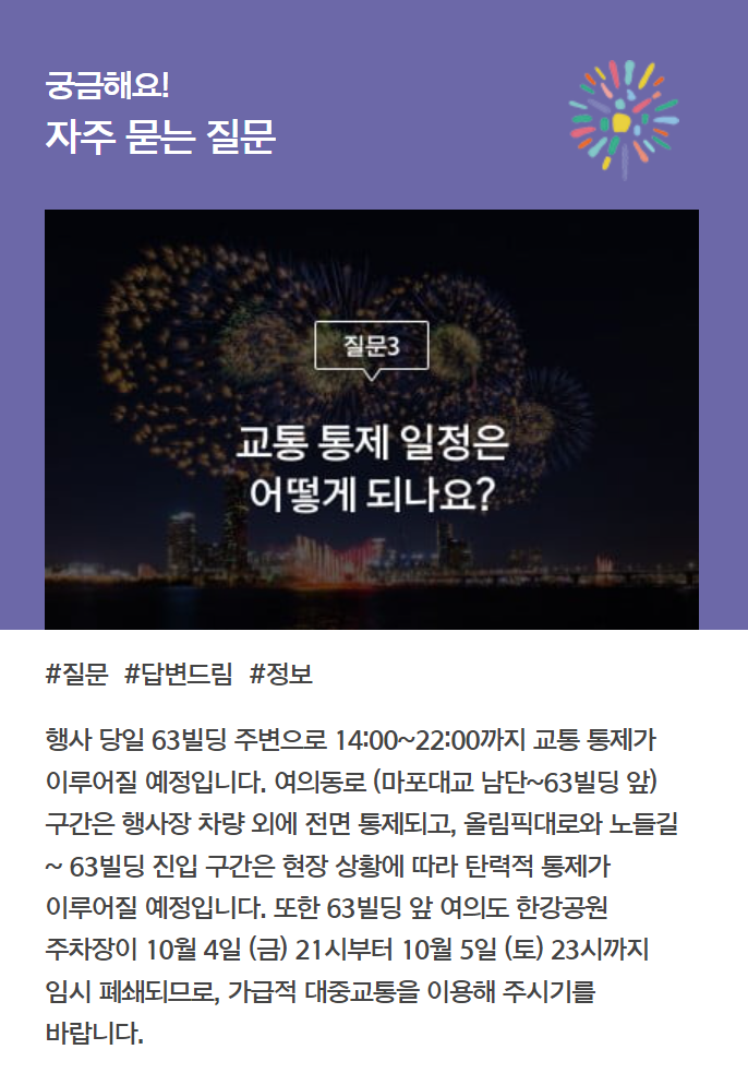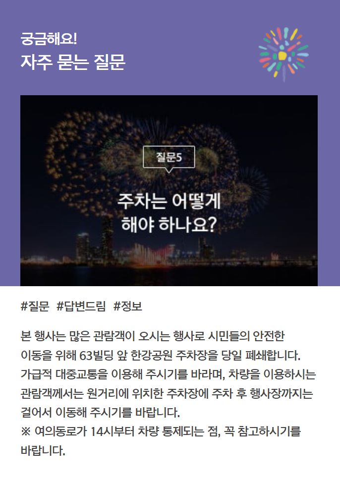 아래에서 여의도 불꽃축제 자주 묻는 질문 리스트와 답변도 참고해보세요 ^^