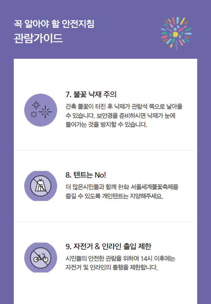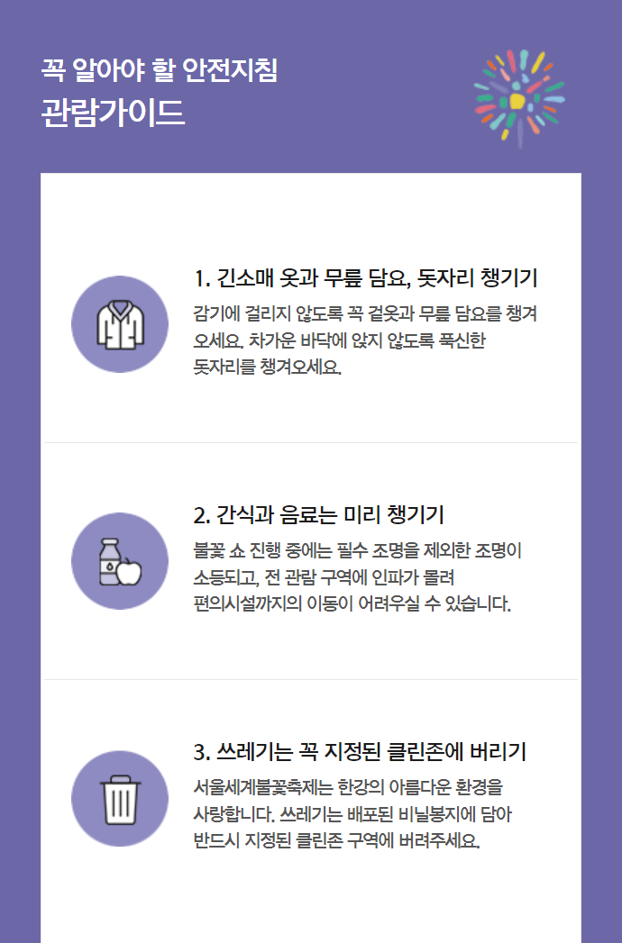 불꽃쇼 진행 중에는 필수 조명을 제외한 조명이 소등되고 전 관람 구역에 인파가 몰려 편의시설까지의 이동이 어려울 수 있으니 간단한 간식과 음료도 챙겨주세요.