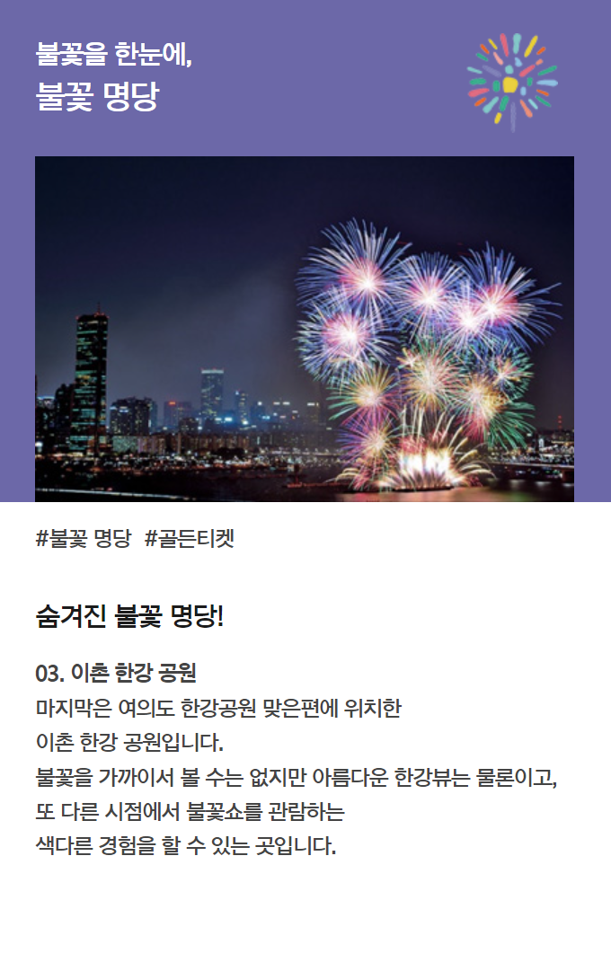 🎇 장점: 여의도 한강공원과 가까우면서도 상대적으로 덜 혼잡하여 여유롭게 불꽃놀이를 감상할 수 있는 곳입니다. 아름다운 한강의 경치를 함께 즐길 수 있습니다.